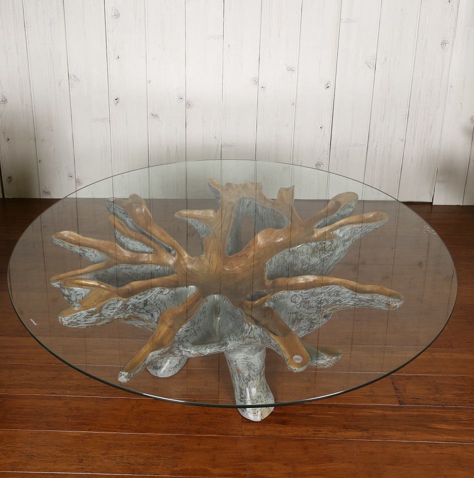 Story behind the art this product was created in north western india. Regular price $1,170.00 sale price $810.00. Usually ships in 24 to 72 hours. The chic teak teak root coffee table with glass top is a piece that makes a truly dramatic style in any space. The sturdy tabletop is ideal for placing various items like drinks, vases, fruit baskets or ornaments.