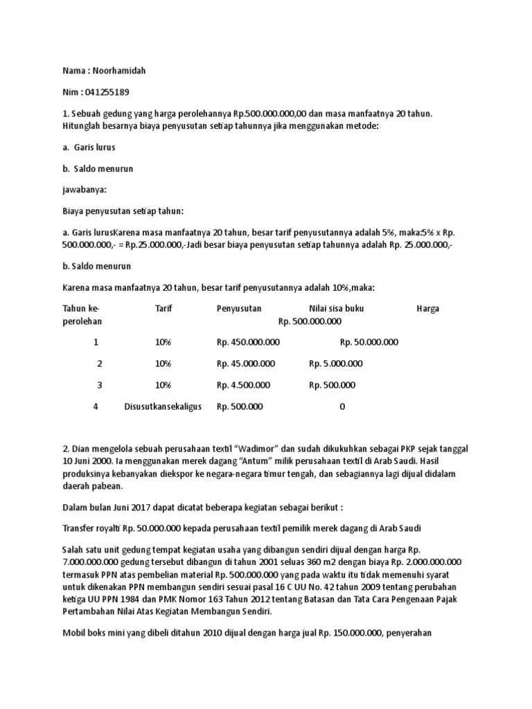 Komputer masuk kategori harta berwujud bukan bangunan (kelompok i). Mempunyai masa manfaat selama 4 tahun, dengan tarif penyusutan 25%. Penyusutan atas pengeluaran untuk pembelian, pendirian, penambahan, perbaikan, atau perubahan harta berwujud, kecuali tanah yang berstatus hak milik, hak guna bangunan, hak guna. Didalam pengisian spt tahunan pph badan, akan ditemui kolom pengisian penyusutan atau amortisasi. Dalam memperhitungkan biaya penyusutan terdapat tiga faktor yang dipertimbangkan yakni nilai aktiva, umur ekonomis dan. 02/06/2020 · artinya, masa penyusutan mesin per tahun, yaitu. 30/03/2020 · penyusutan tahun pajak 2019 = 12,5% x rp30.000.000 = rp3.750.000. 16/11/2018 · penyusutan adalah alokasi biaya perolehan suatu aktiva tetap selama masa manfaat, kecuali tanah. Pengajar brevet a dan b di tax center feb unpad. 11/03/2021 · dalam perpajakan metode perhitungan penyusutan hanya menggunakan garis lurus atau saldo menurun. Alumni magister administrasi dan kebijakan perpajakan angkatan vi fisip universitas indonesia. Apapun jenis perusahaannya penyusutan akan muncul dalam laporan keuangan karena adanya aset tetap dalam neraca. 19/10/2021 · penyusutan fiskal dan penerapannya di spt tahunan 5/5 (1) salah satu unsur biaya dalam laporan laba rugi suatu perusahaan adalah biaya penyusutan.